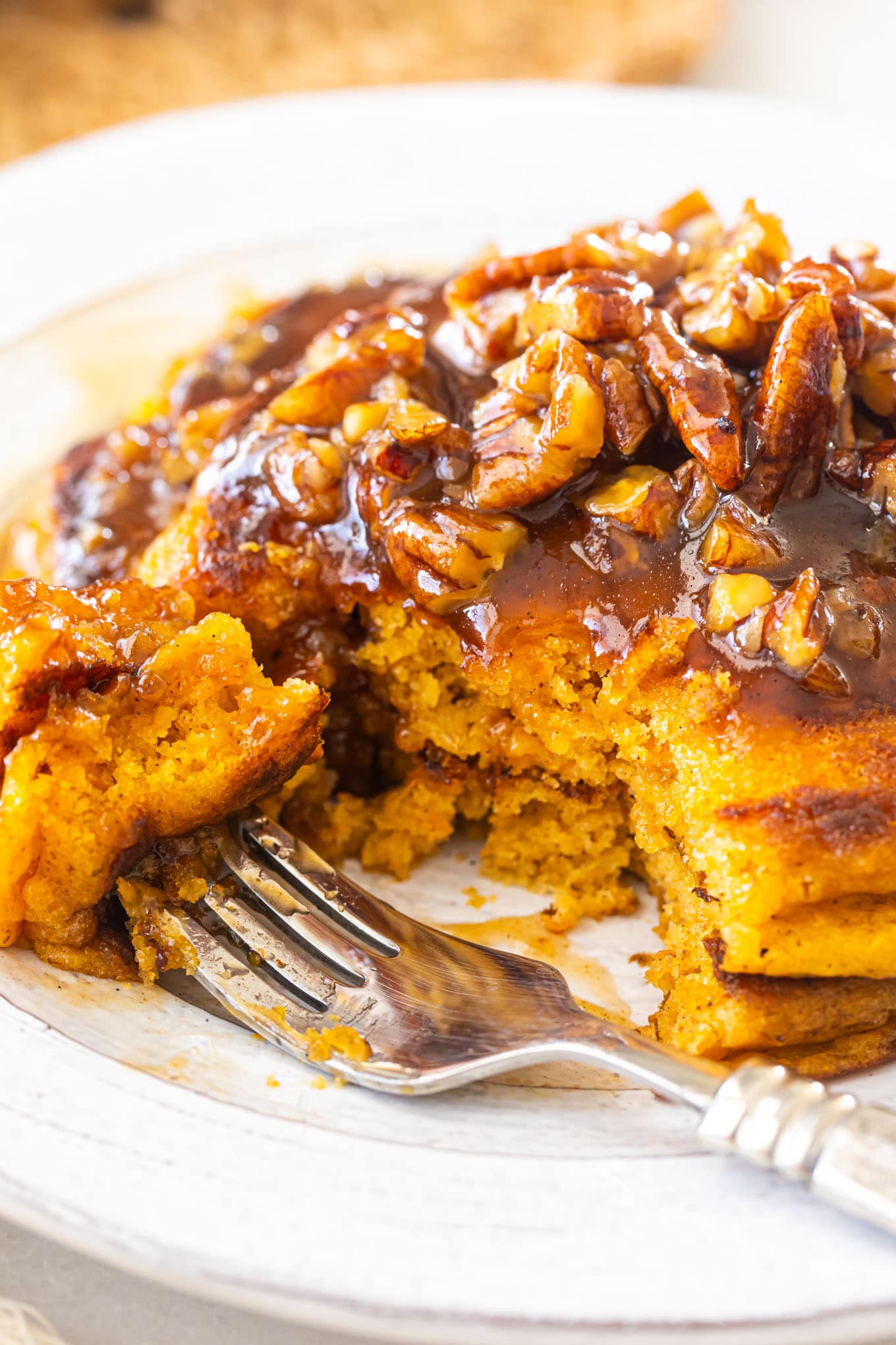 Warm, spiced pancakes made with mashed sweet potatoes, topped with toasted pecans and maple syrup.
